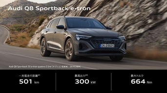 *1 Audi Q8 Sportback 55 e-tron quattro S lineの場合。数値は一充電走行距離(WLTCモード)。国土交通省審査値。一充電走行距離は、定められた試験条件での値です。実際の走行時には、お客様の使用環境(気象、渋滞等)や運転方法(急発進、エアコン使用等)に応じて大きく異なります。WLTCモードは、市街地、郊外、高速道路の各走行モードを平均的な使用時間配分で構成した国際的な走行モードです。